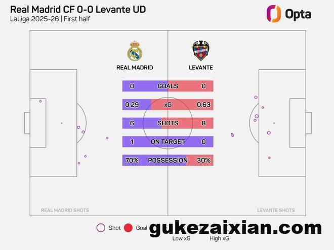本场比赛上半时皇马的表现很难用出色来形容,前45分钟他们只尝试了6次射门,1次射正,相较而言莱万特上半时的射门次数达到了8次。