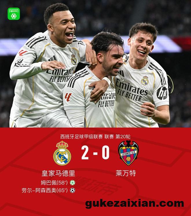北京时间1月17日,西班牙足球甲级联赛第20轮展开较量,皇家马德里坐镇主场迎战莱万特。比赛中,姆巴佩造点后亲自操刀命中打破僵局。随后居莱尔送出精准助攻,劳尔-阿森西奥抓住机会再下一城。最终,皇家马德里以2-0战胜对手,全取三分。