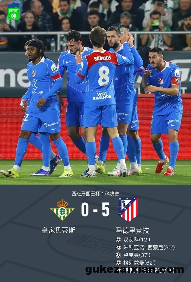 北京时间2月6日西班牙国王杯 1/4决赛,皇家贝蒂斯对阵马德里竞技。上半场,汉茨科率先破门。鲁杰里助攻,小西蒙尼建功。巴里奥斯传球,卢克曼首秀破门。下半场,卢克曼助攻,格列兹曼得分。终场前,格列兹曼射门被扑出,阿尔马达补射得手。全场比赛结束,马竞客场5-0大胜贝蒂斯,成功晋级国王杯4强。
