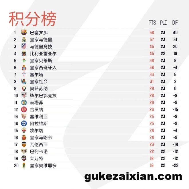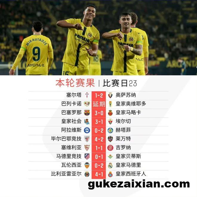 随着今日凌晨比利亚雷亚尔4比1大胜西班牙人,除开巴列卡诺对阵皇家奥维耶多的比赛延期外,西甲第23轮的其余九场比赛全部战罢。积分榜方面,巴塞罗那、皇家马德里双双取胜,前者仍然以1分优势领跑西甲联赛;马竞本轮0比1不敌皇家贝蒂斯,尽管多赛一场,但积分已被身后的比利亚雷亚尔追平,皇家贝蒂斯则紧随其后、位列欧联区。