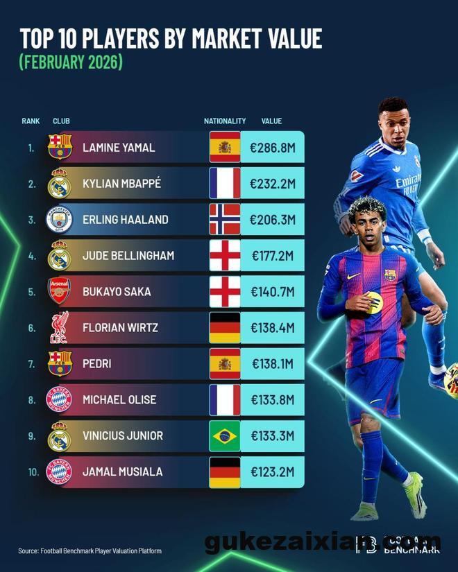 Football Benchmark最近更新了球员身价,作为一家专业的足球数据分析机构,他们的报告排名还是具备一定的权威性的。和德转的身价有细微的区别,Football Benchmark的球员身价会综合考虑球员的年龄、合同年限竞技表现甚至是合同经济能力等多重因素,最终给出相关的排名。在最新的榜单当中,巴萨核心亚马尔依然霸占榜首,给出的市场预估身价为2.868亿欧元。