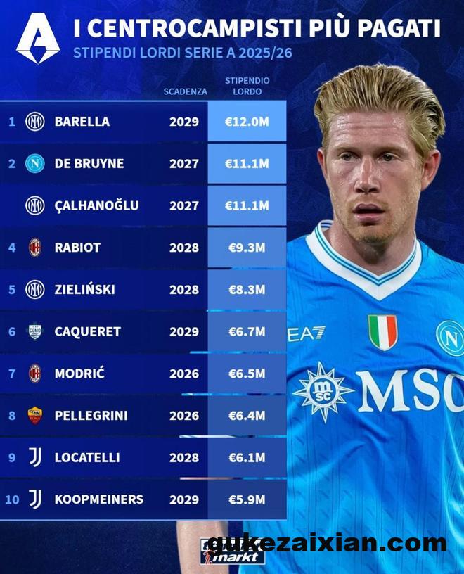 德转统计本赛季意甲中场球员税前年薪TOP10: