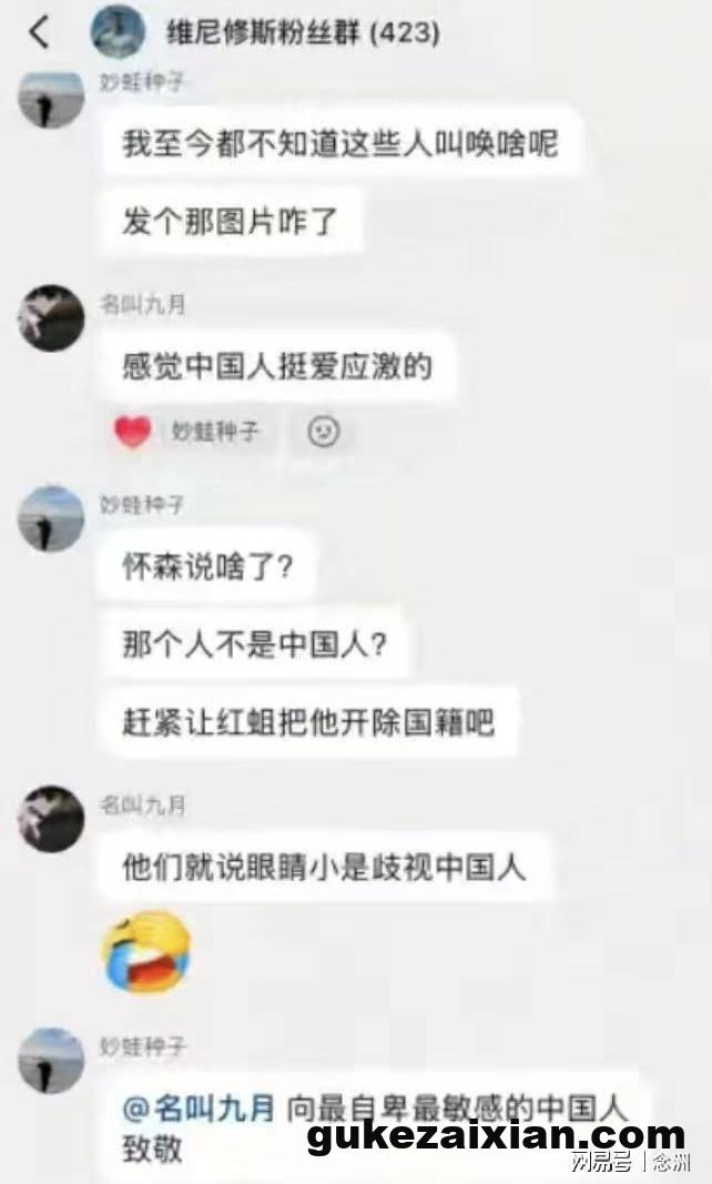 据网友爆料,在国内的一个423人的维尼修斯粉丝群里面,某球迷表示:“我至今都不知道这些人叫唤什么,发个图片咋了?赫伊森说啥了?那个人不是中国人?赶紧把他开除国籍吧。”