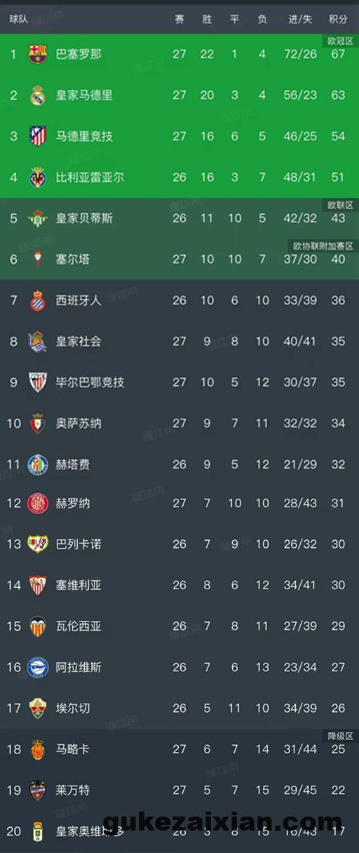 西甲最新积分榜