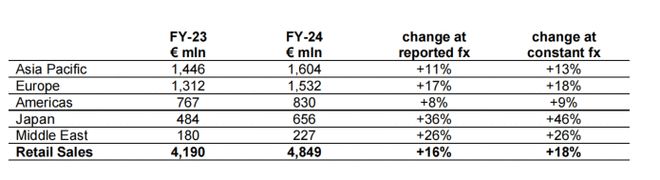 报告里还指出,亚太地区全年按固定汇率计算增长11%,超过欧洲地区5%的两倍。上海和新加坡的新店、纽约第五大道和香港历山大厦店的翻新,是该年度最重要的零售项目。
