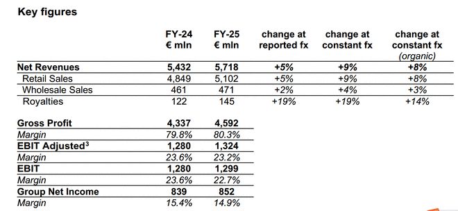 2025年财报稳中有进,按照固定汇率计算的净营收同比增长9%,并且实现了连续20个季度都在增长。净利润同比增长2%,资产负债表相当稳健,现金流表现非常强劲,比如顺手收购了一个同样大名鼎鼎的Versace。