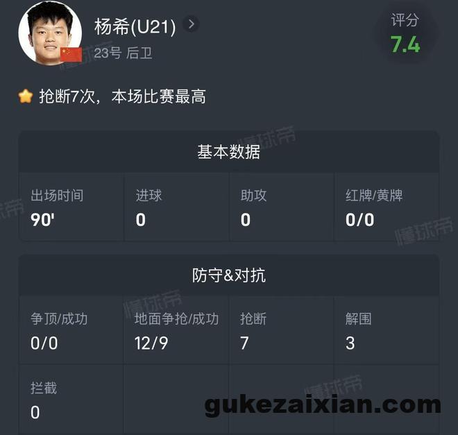 对阵库拉索的比赛,刘浩帆、杨希、徐彬、王钰栋4名此前随队参加U23亚洲杯的U23国脚代表国足首发出场,他们4人也作为首发球员参加U23亚洲杯决赛,其中杨希和徐彬也完成了他们在成年国家队的首秀。本场比赛杨希作为首发右后卫打满90分钟,完成全队最高的7次抢断、12次地面对抗成功9次以及3次解围的亮眼数据。库拉索作为归化大队,在进攻端相当依赖球员的个人发挥,杨希本场比赛完全遏制住了库拉索的左路进攻。用杨希自己的话来说:“在中超都防的是外援,早就熟悉了这种强度。”